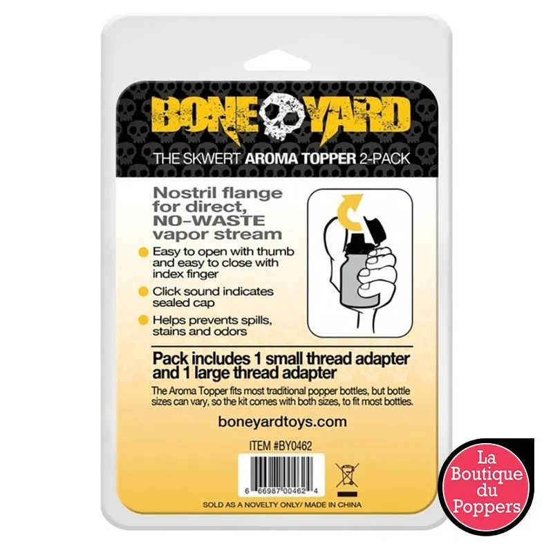 Les bouchons pour Aroma Popper Topper sont des accessoires pratiques pour refermer les flacons d’arômes en toute sécurité. Ce lot comprend deux bouchons, qui conviennent aux deux tailles existantes de flacons. Les bouchons assurent une étanchéité parfaite pour conserver la qualité des arômes d’ambiance. Ces bouchons sont particulièrement recommandés pour une utilisation sereine du poppers. Fabriqués en plastique ABS, ils sont résistants et durables.
